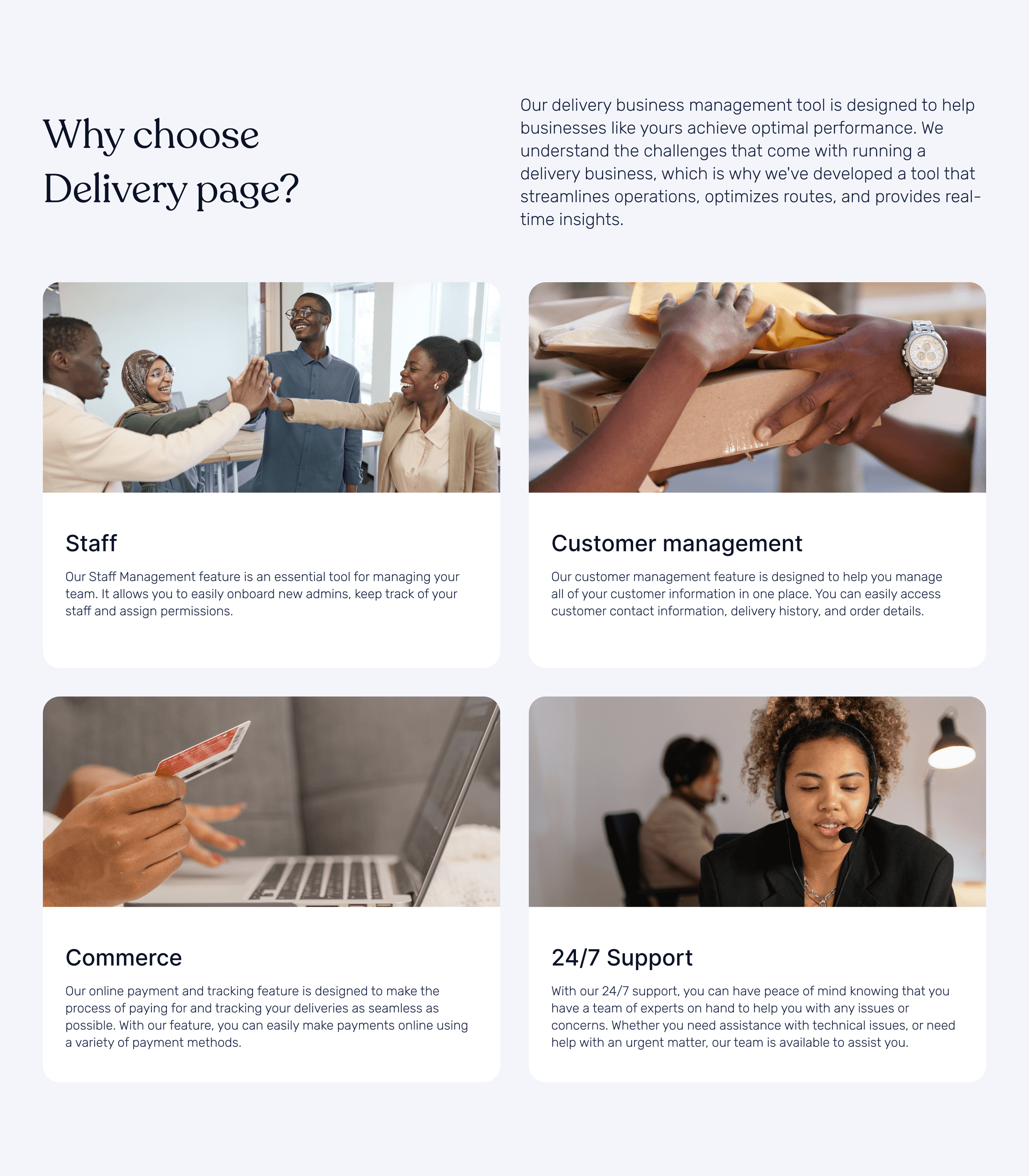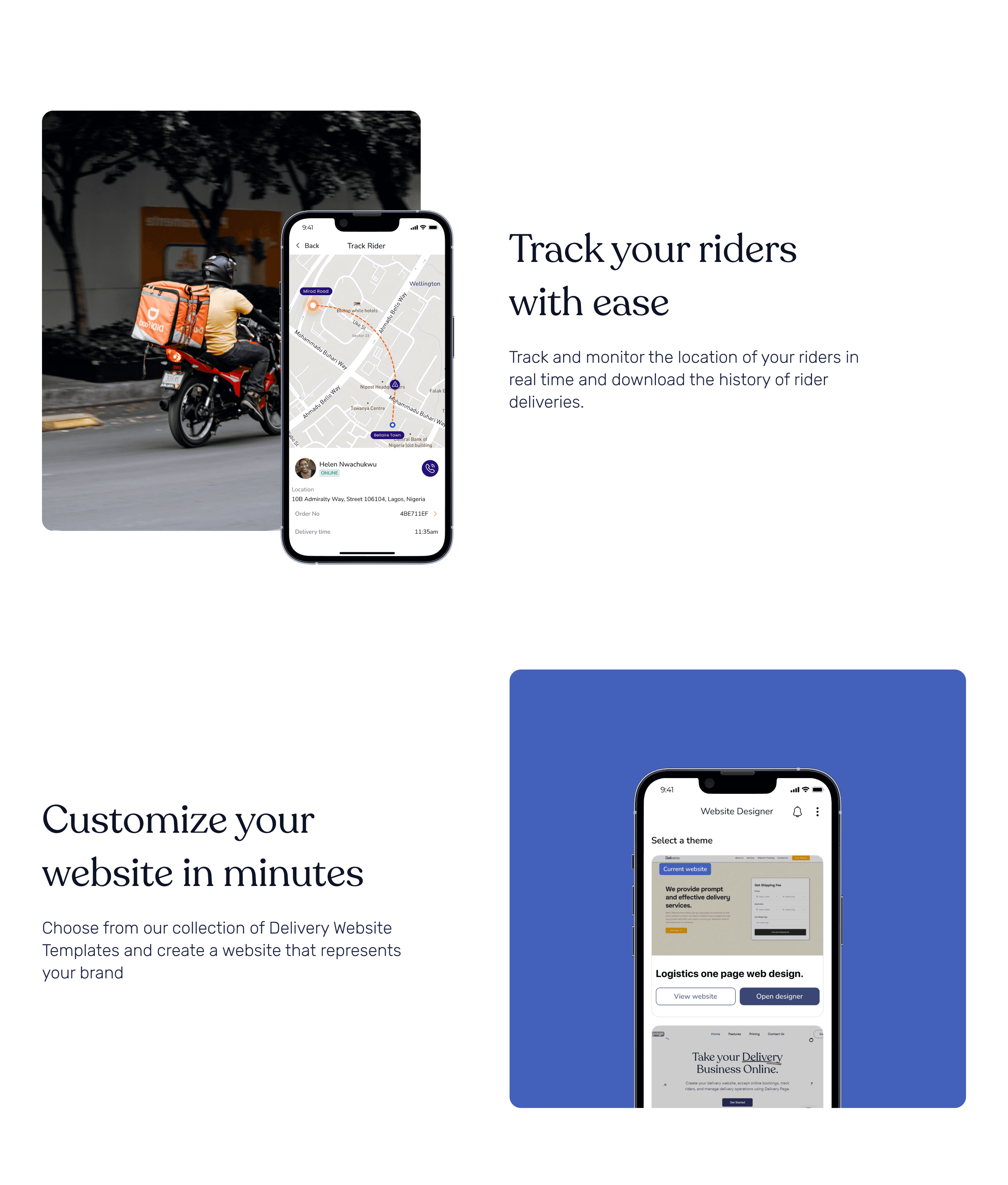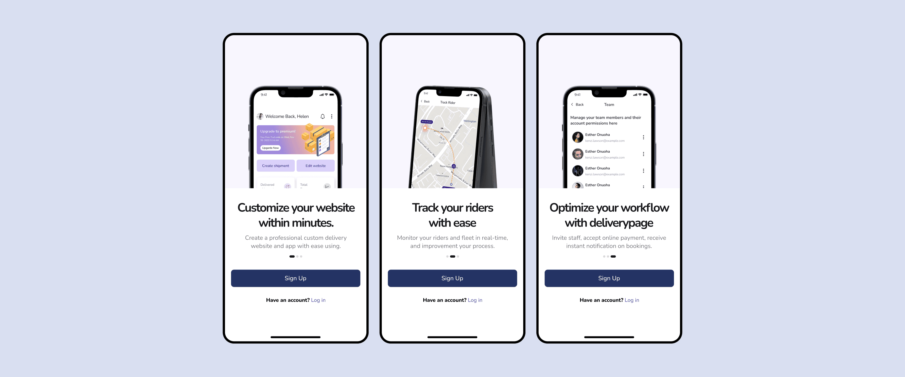 Delivery Page is a SaaS platform helping logistics businesses create booking websites and track deliveries. I designed the entire product suite: marketing website, website builder tool for logistics companies, and rider tracking mobile app.