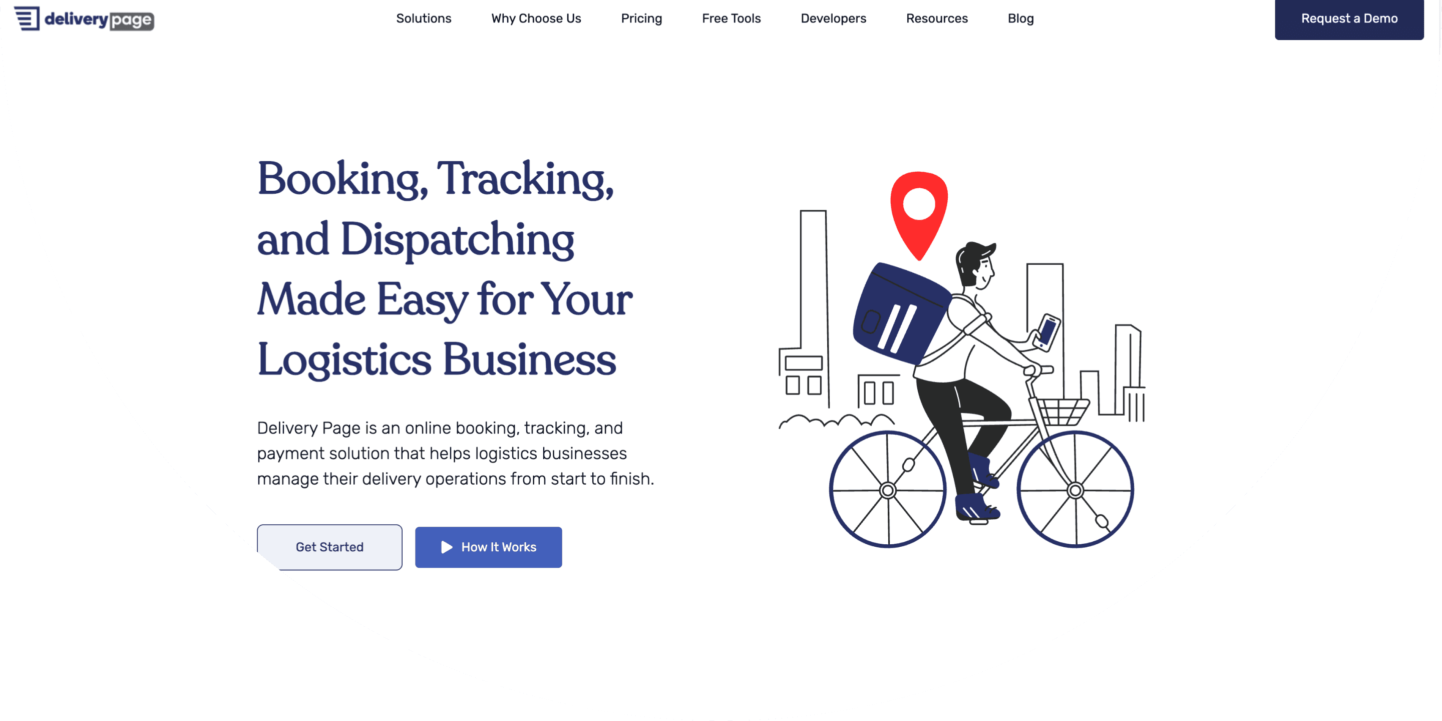 Hero section: "Booking, Tracking, and Dispatching Made Easy for Your Logistics Business"