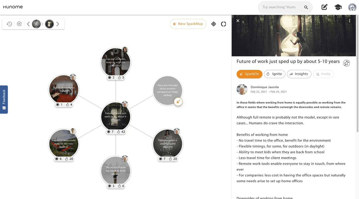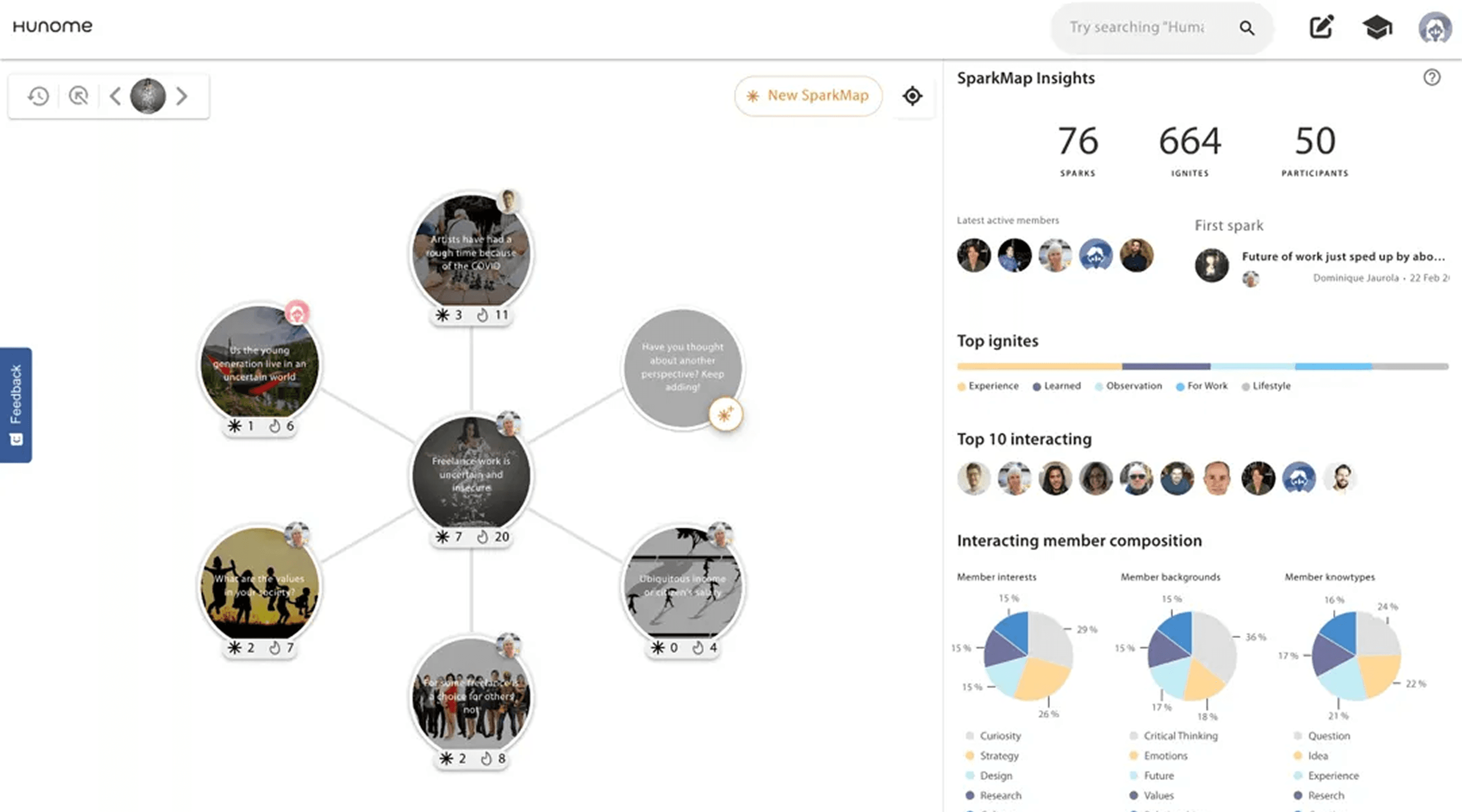 Hunome is a collective sensemaking platform where users create "Sparks" (perspectives) and connect them into "SparkMaps" (visual knowledge networks). I redesigned the UI system to make this complex, unfamiliar interaction model intuitive and clear.